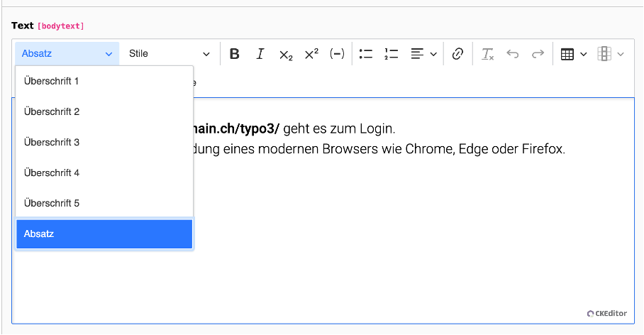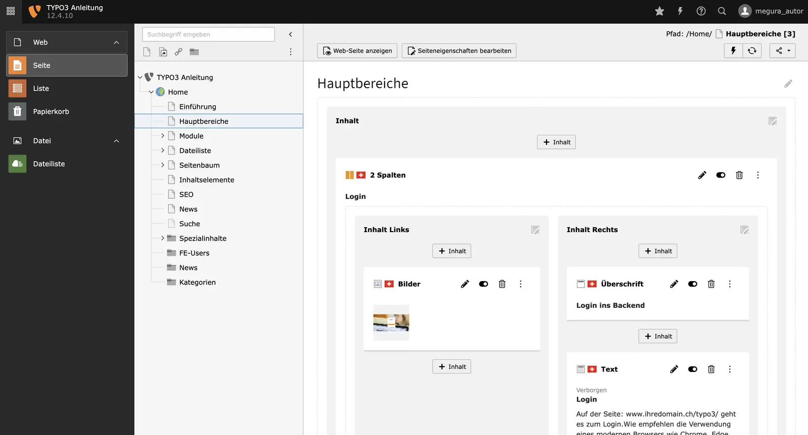 • Login ins Backend: www.ihredomain.ch/typo3/
