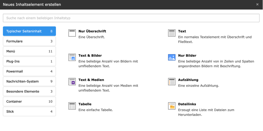 • Text, Text mit Bild, Medien, Tabellen, Downloads, Formulare