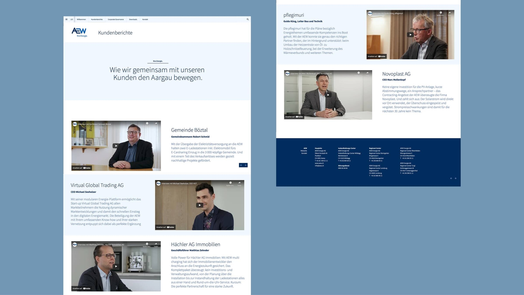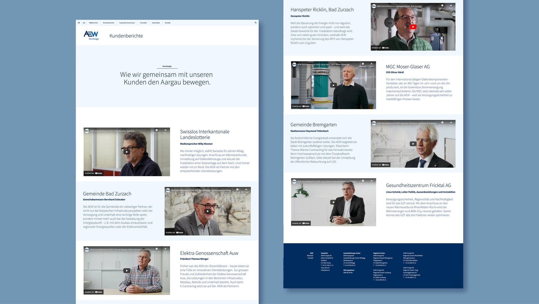 Basierend auf dem bestehenden Claim «Ihre Energie» erarbeiten wir einen Storytelling-Ansatz, der die Kunden ins Zentrum rückt – und zwar medienübergreifend. Online werden Zahlen und Fakten präsentiert, filmisch untermalt mit Interviews von Kunden und Führungspersonen der AEW. In der gedruckten Ausgabe finden sich weitere Kunden-Stories sowie die wichtigsten Informationen zur AEW, sodass diese auch als Image-Broschüre eingesetzt werden kann.