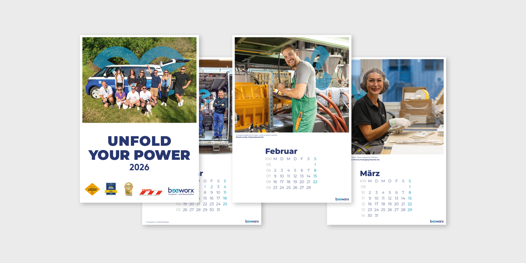 Neben der Website wurden auch Briefschaften, Broschüren, Kalender und weitere Kommunikationsmittel im neuen Design realisiert. Das sorgt für ein einheitliches Erscheinungsbild und stärkt die visuelle Identität der Marke auf allen Ebenen. Der neue Markenauftritt positioniert Beeworx als modernen, professionellen und verlässlichen HR-Partner. Er vereint Design, Symbolik und Kommunikation zu einem konsistenten, starken Markenauftritt – und macht die Werte und Stärken des Unternehmens klar erlebbar.