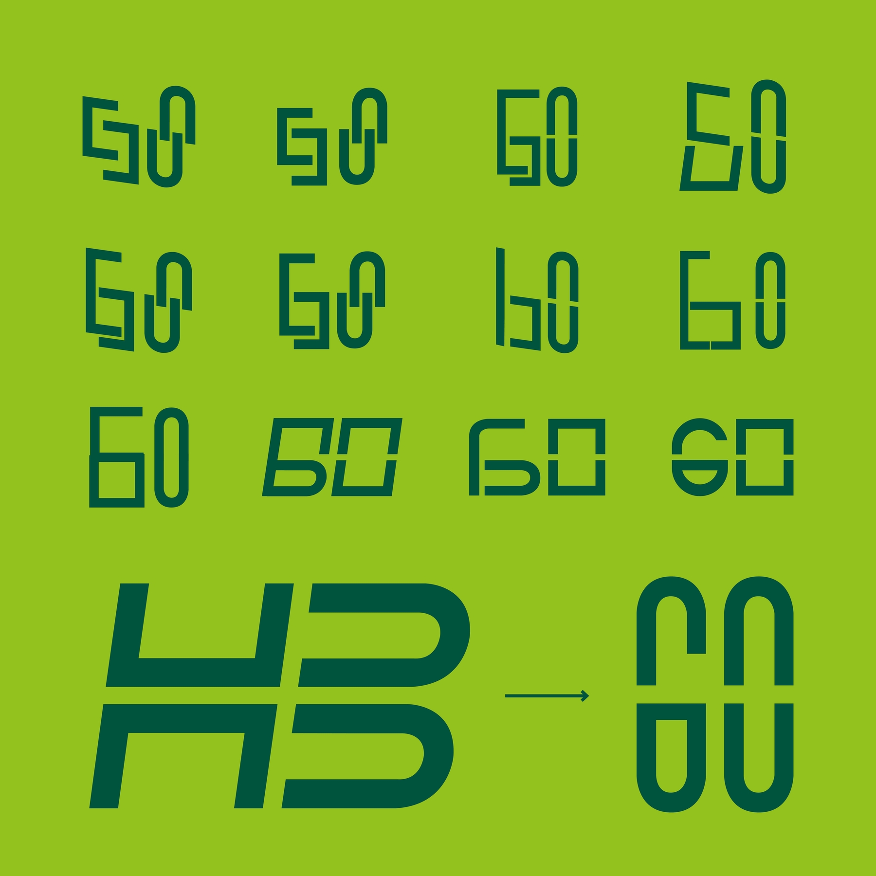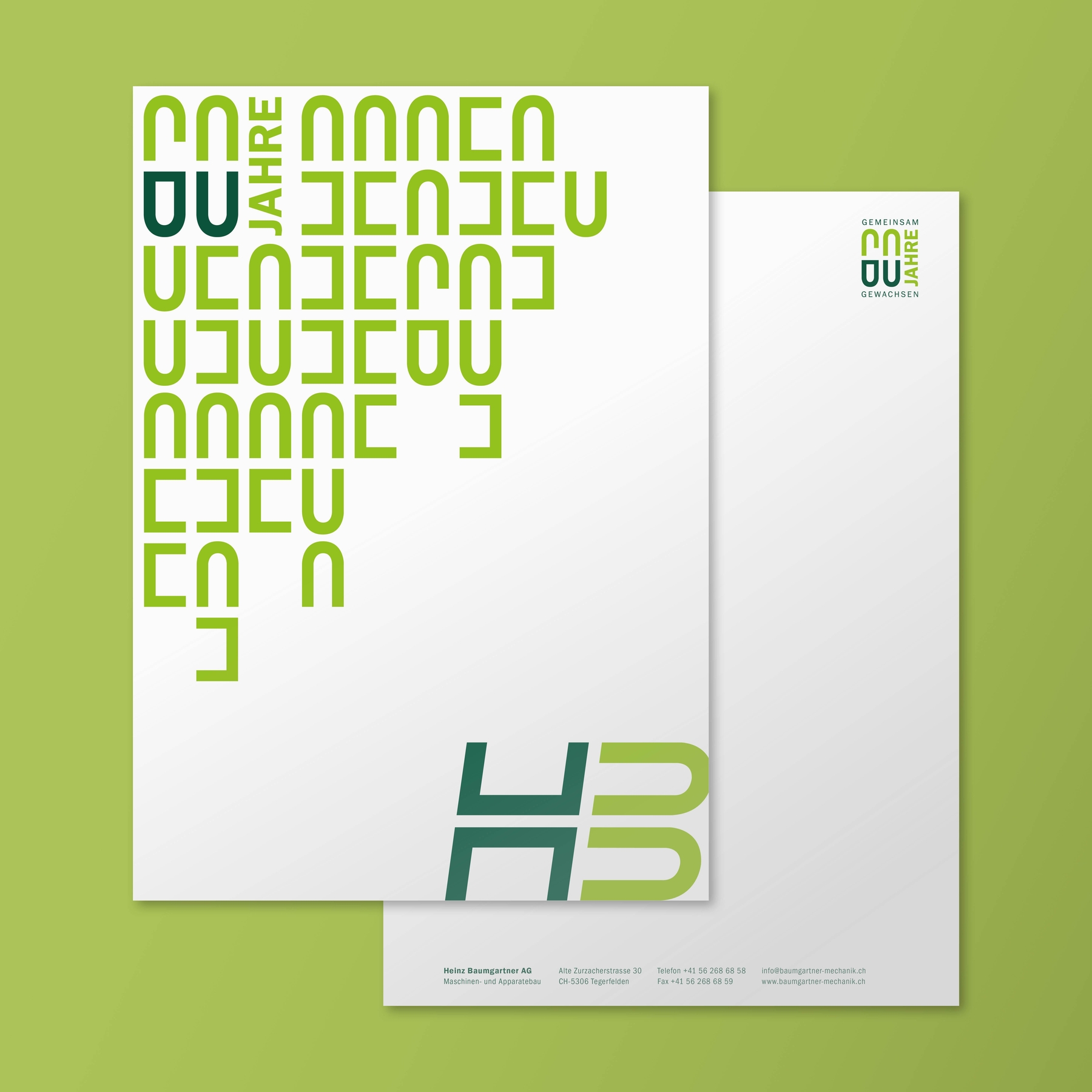 Durch neues Aneinanderfügen der Einzelelemente des Heiz Baumgartner AG Logos entstand die personalisierte Jubiläums-Wortmarke.