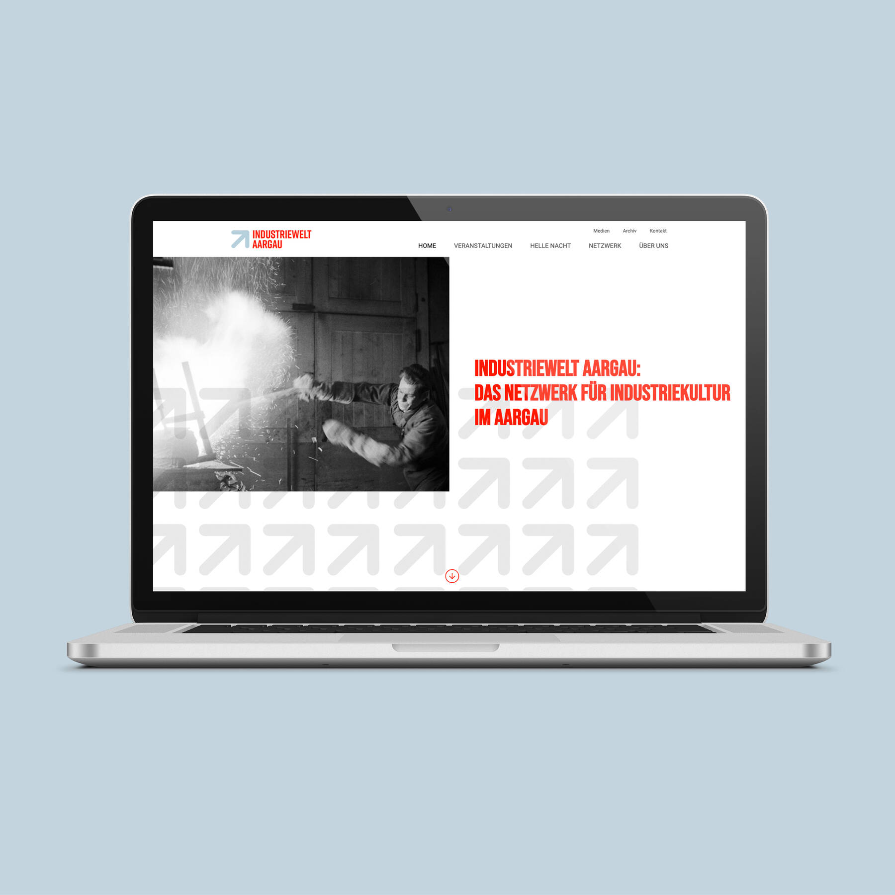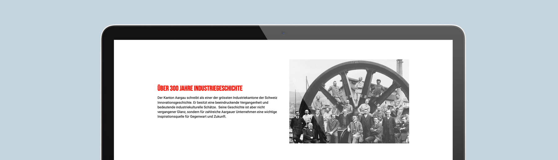 Als Ausgangslage diente das bestehende Corporate Design, das in seiner Dynamik den fortlaufenden Aufschwung von Industrie und Wirtschaf spiegelt. Für die Webseite wurde das Erscheinungsbild weiter reduziert und modernisiert. Auch die Webseiten-Struktur leicht angepasst und einfacher gestaltet. Entstanden ist so eine zeitgemässe Webseite, auf der die vielfältigen Informationen auf benutzerfreundliche und attraktive Art vermittelt werden.