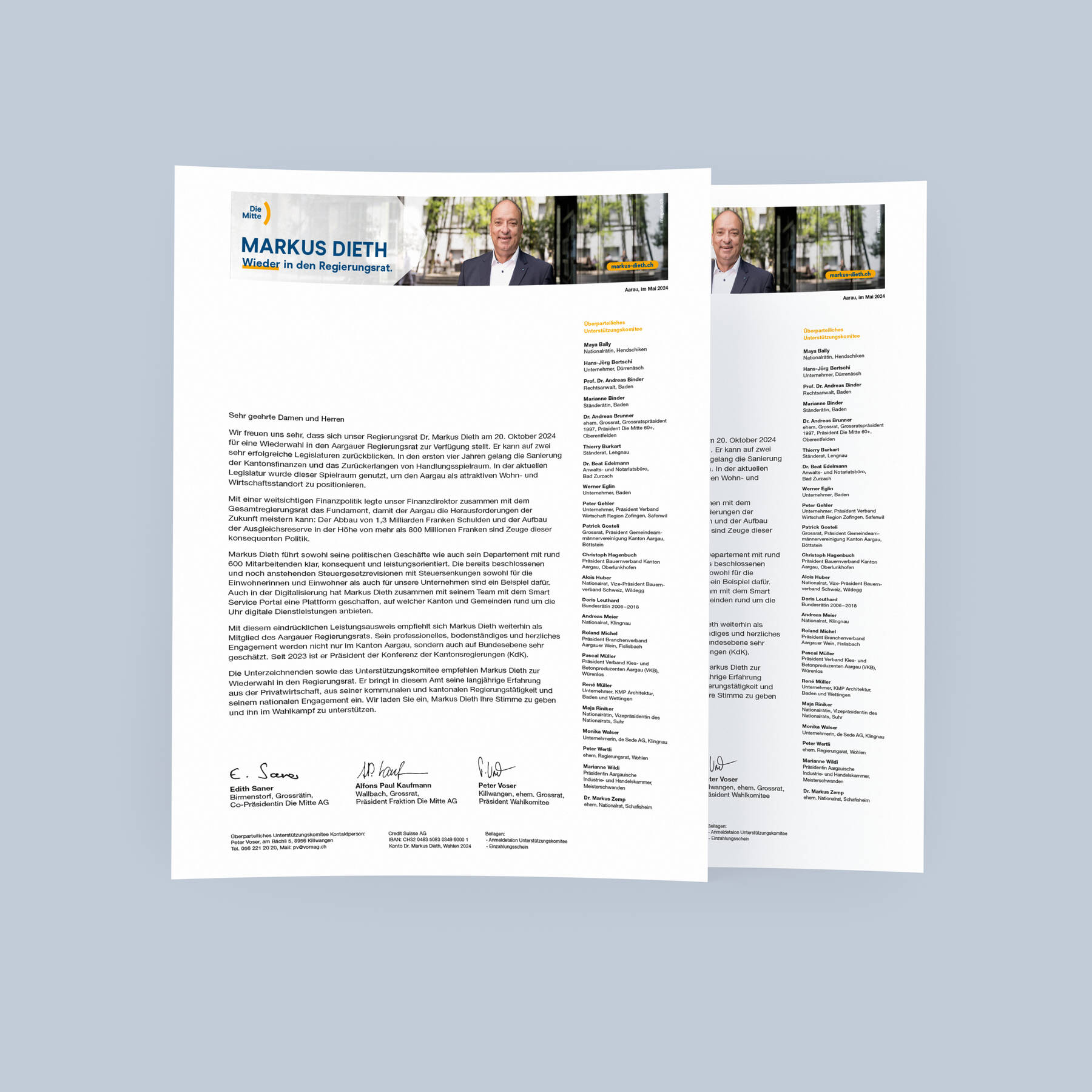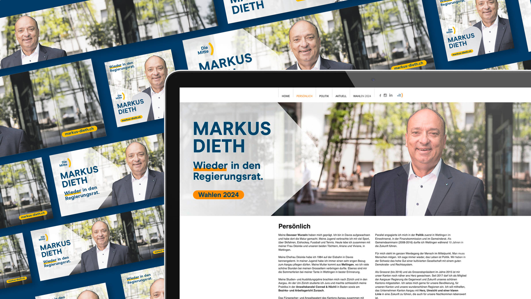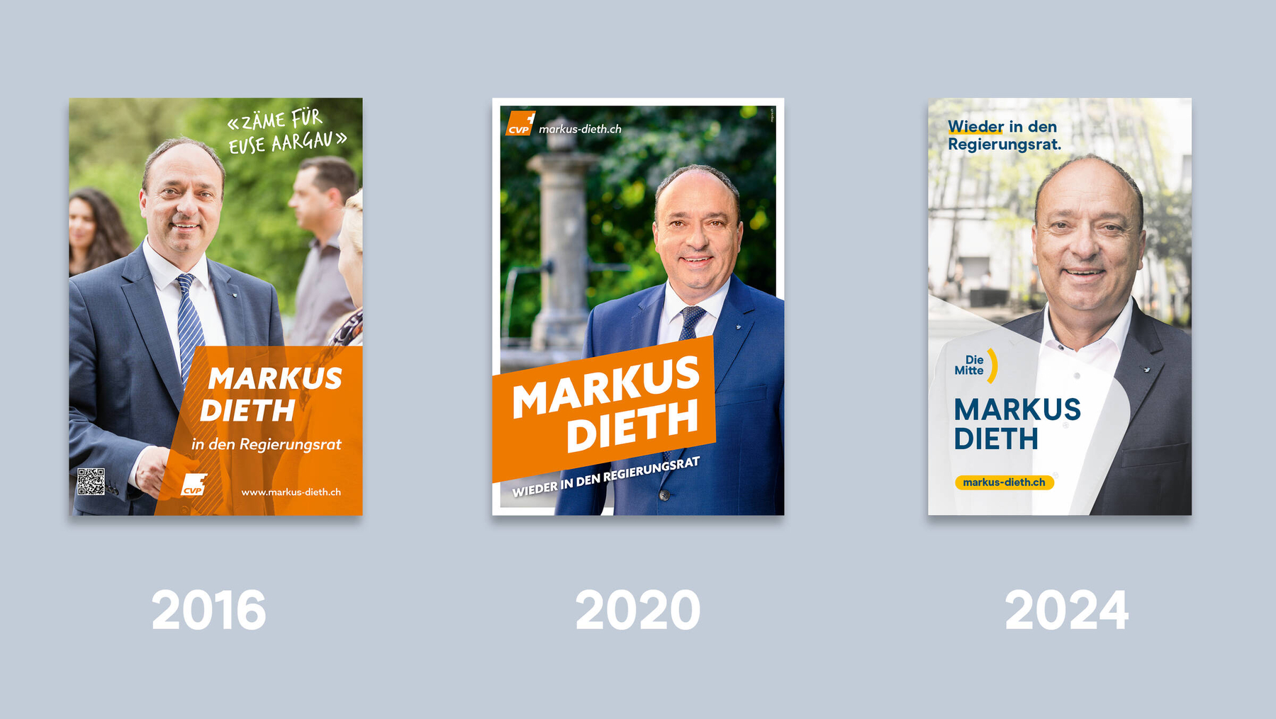 Markus Dieth spricht für sich: Die Wertschätzung für seine geleistete Arbeit ermöglicht es, eine visuell und inhaltlich reduzierte Kampagne zu fahren, bei der einizg das Wort «wieder» akzentuiert wurde. Bei der Publikation wurde auf die ganze Klaviatur der Aargauer On- und Offline-Medienlandschaft zurückgegriffen.