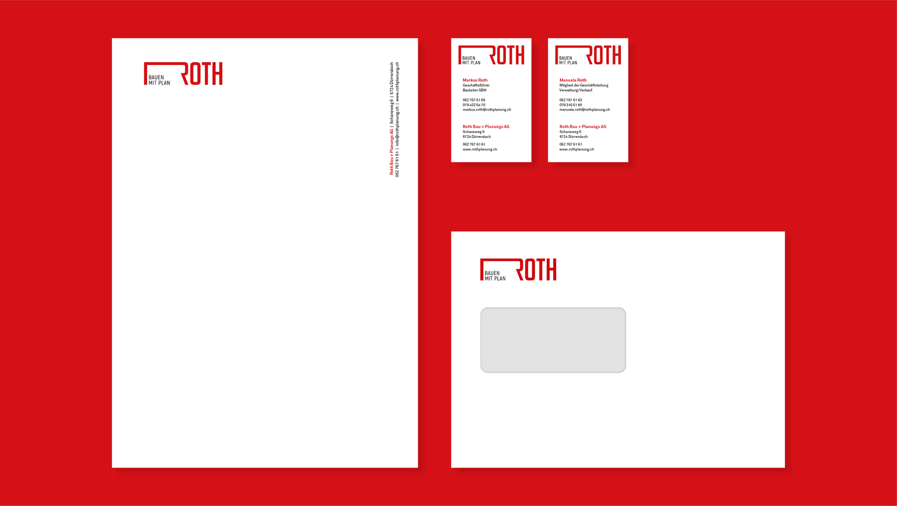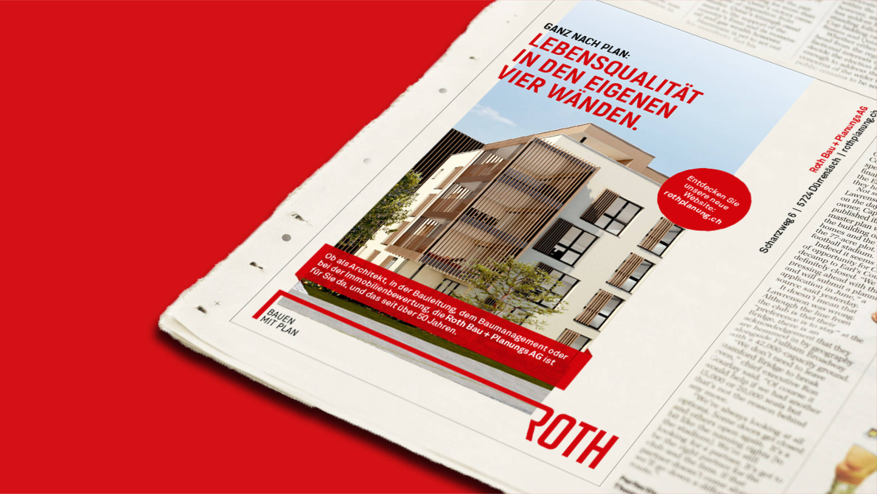 In Form gebracht und nach Plan realisiert: Die Roth Bau + Planungs AG wird im On- und Offline-Auftritt frisch und zeitgemäss präsentiert. Die Website zeigt in leuchtender Farbe und modernem Auftritt die Dienstleistungen und Projekte der Firma. Ihr Angebot wird in digitalen sowie analogen Medien verbreitet.