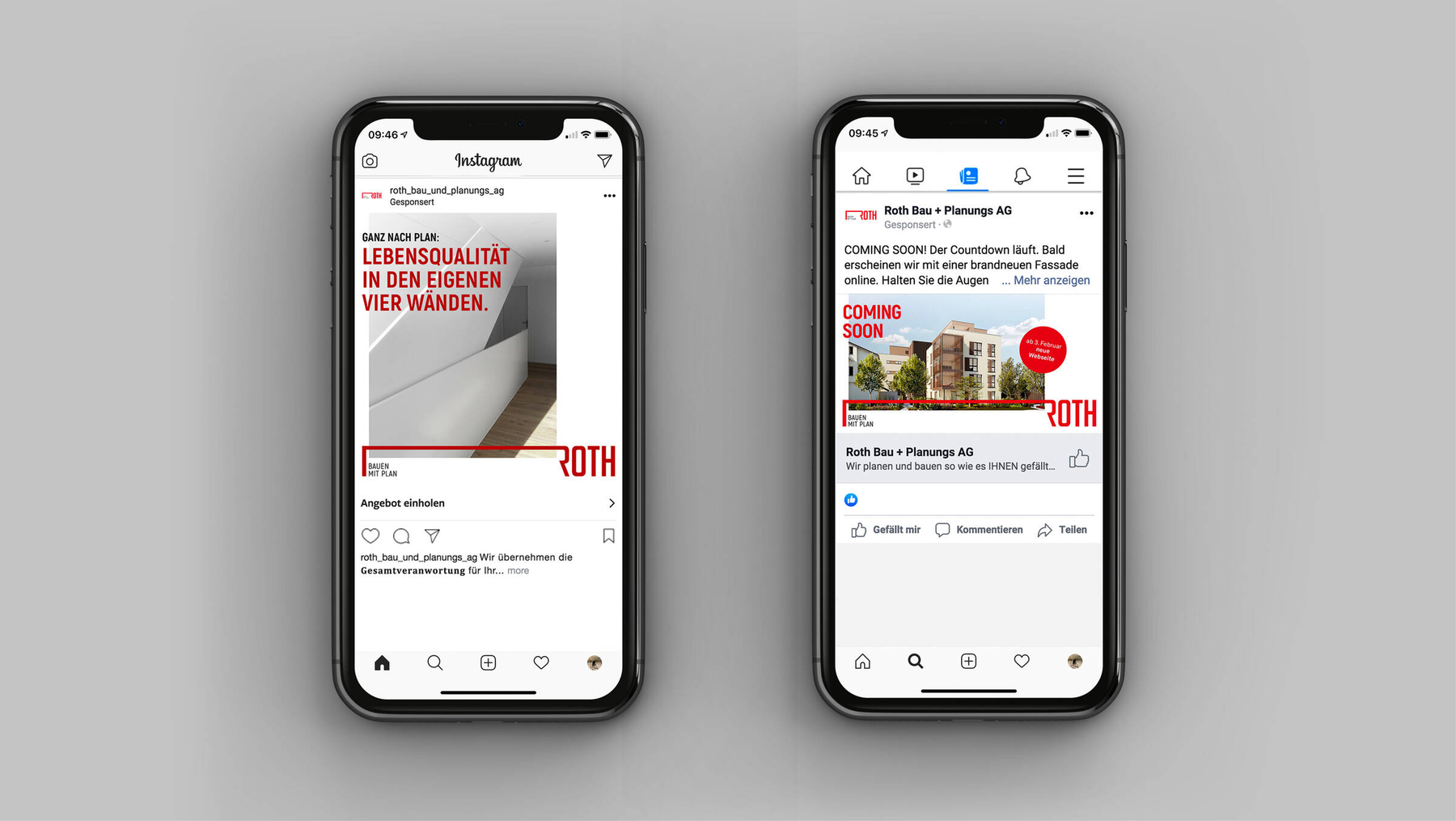 Das neue Logo ist nach Belieben ausdehnbar und wiederspiegelt die diversen Stile der Roth Gebäude. Briefschaft, Autobeschriftungen und Inserate vervollständigen den neuen Auftritt. Social Media- und Google Ads-Kampagnen vermarktet das Angebot gegen Aussen.